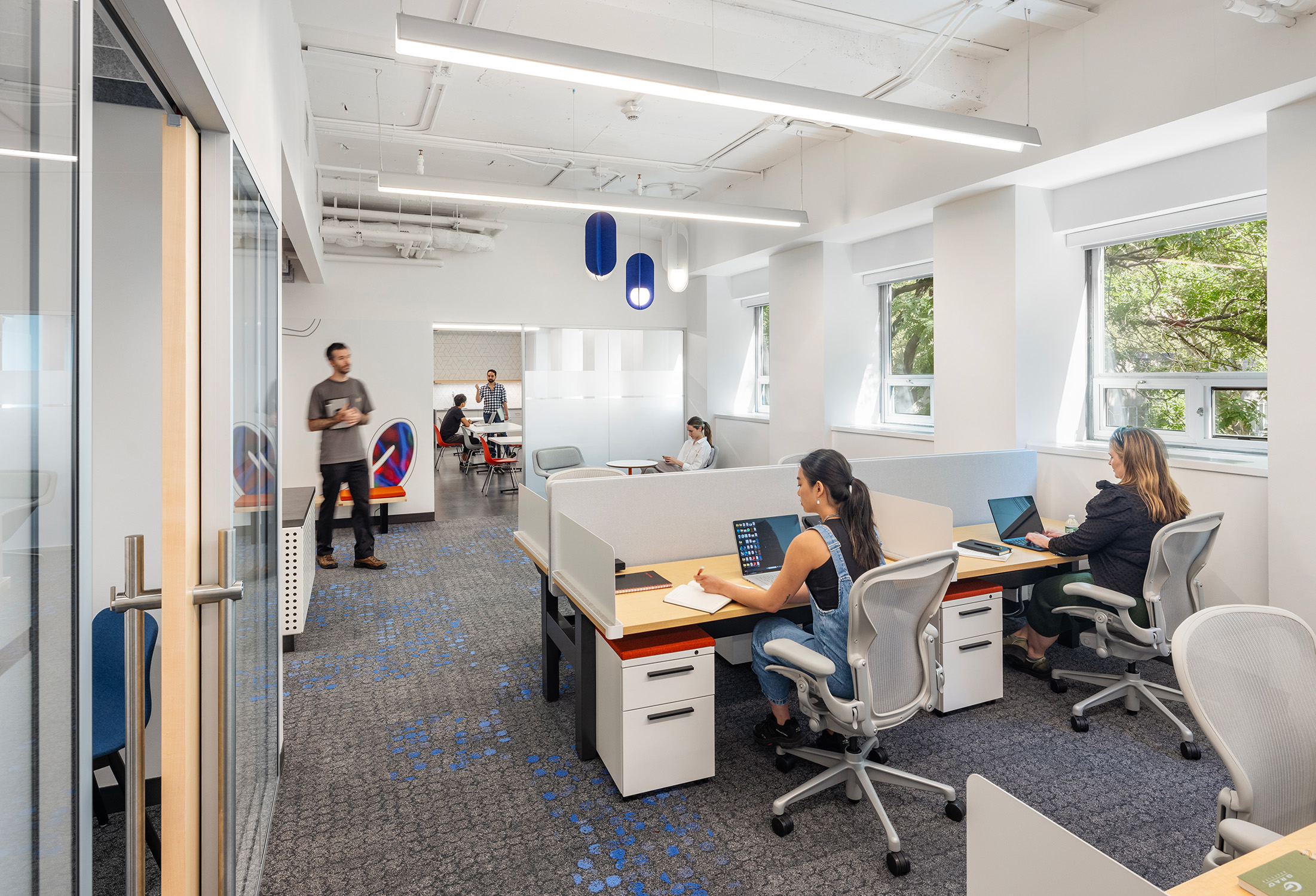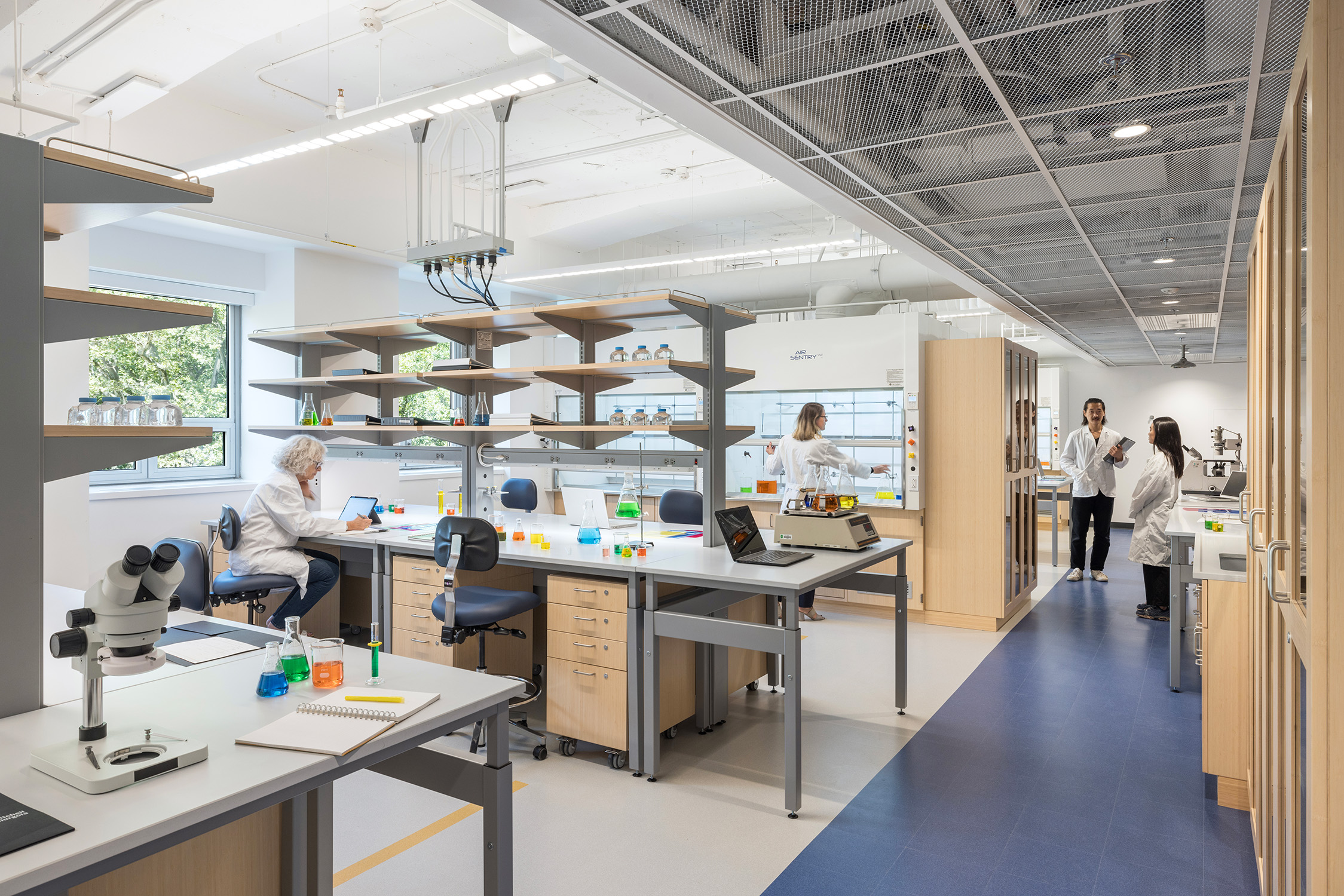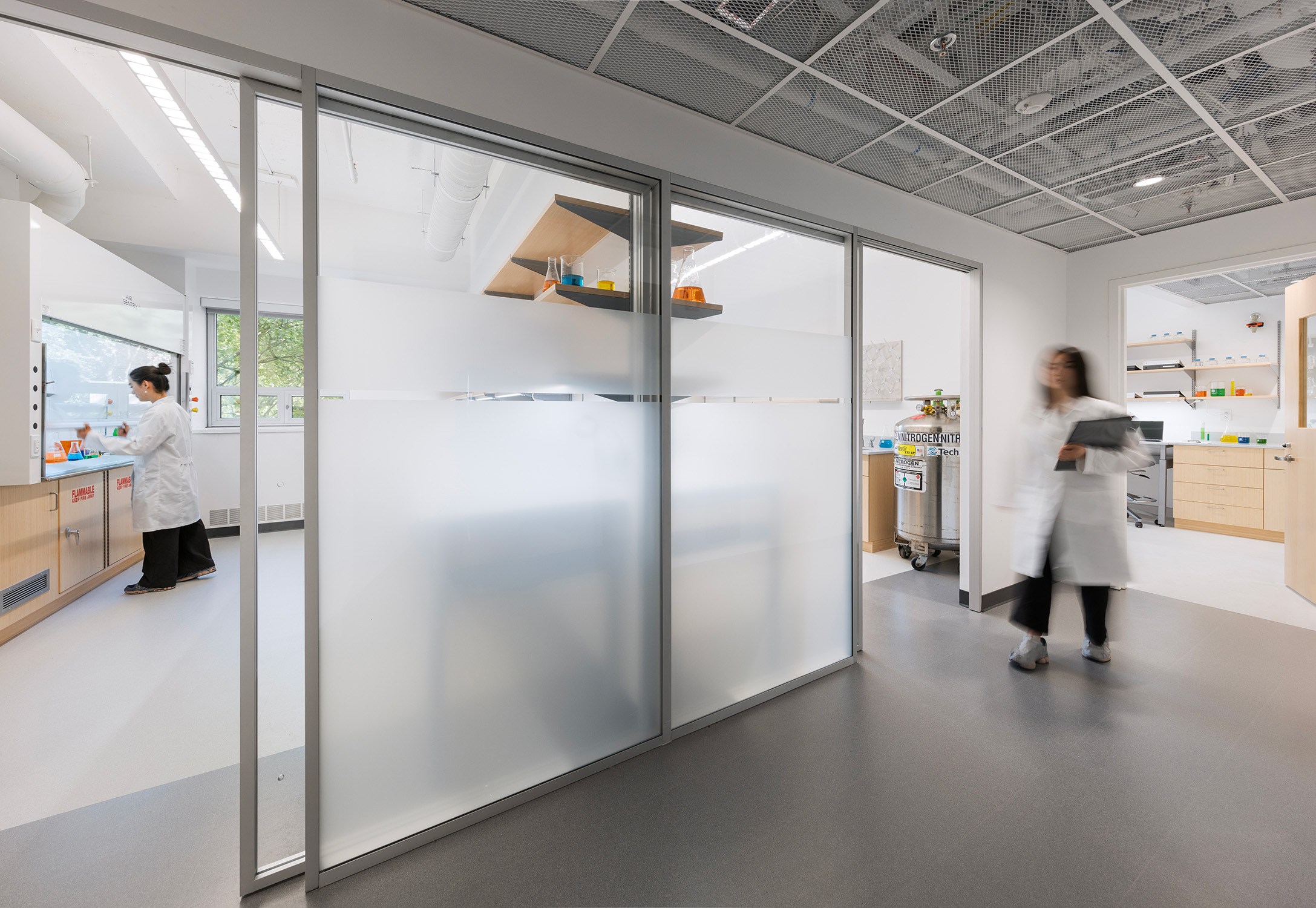 The Tri-I TDI space contains specialty labs for Antibody Development, Chemistry, Small Molecule Biology, and Engineering and Bioanalysis, as well as office suites and lab support rooms. The Ford Center contains a combination of small “private” and open wet labs, as well as dry labs, tissue culture and equipment rooms. The renovated spaces for both Tri-I TDI and the Ford Center utilize flexible movable laboratory bench systems. Interior glass partitions, wood elements, pattern, graphics and color are used extensively in the design to create a light, open, welcoming environment intended to foster interaction and collaboration.