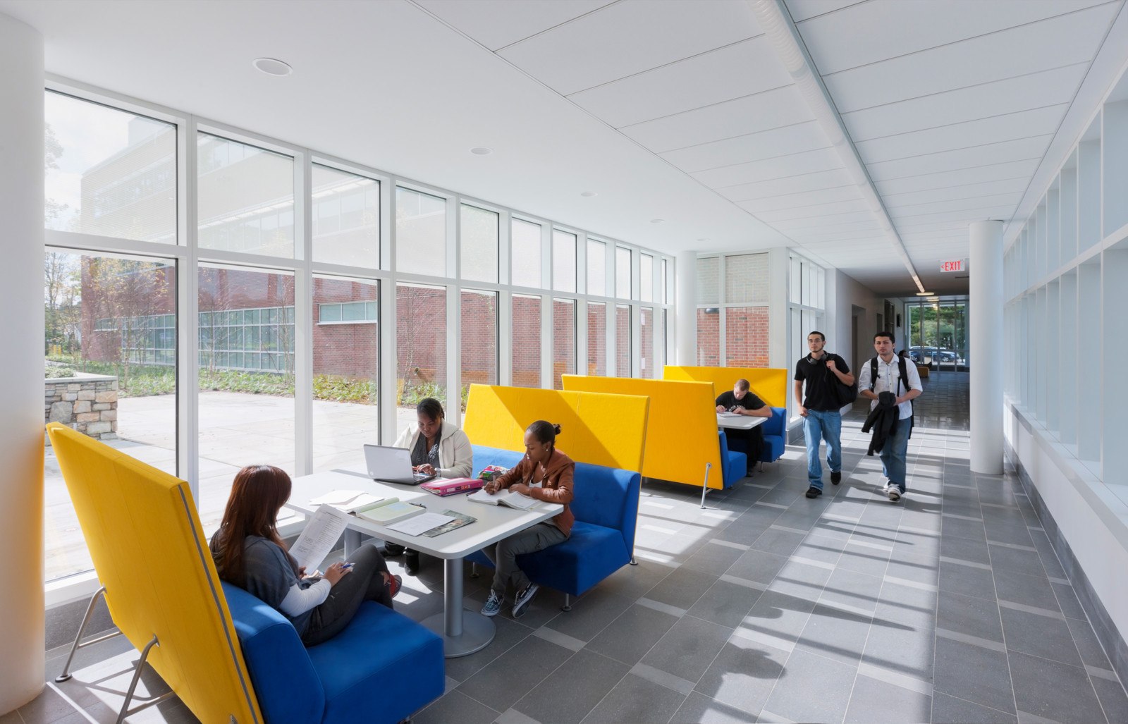 As part of NCC’s West Campus Development Initiative, the design team developed a master plan that called for the new Center, upgrades to existing buildings adjacent to the Center, a site for future college expansion, and the creation of a new entry drive and landscaped courtyards framing the new facility. What was previously a service area has become a second front door to the College.