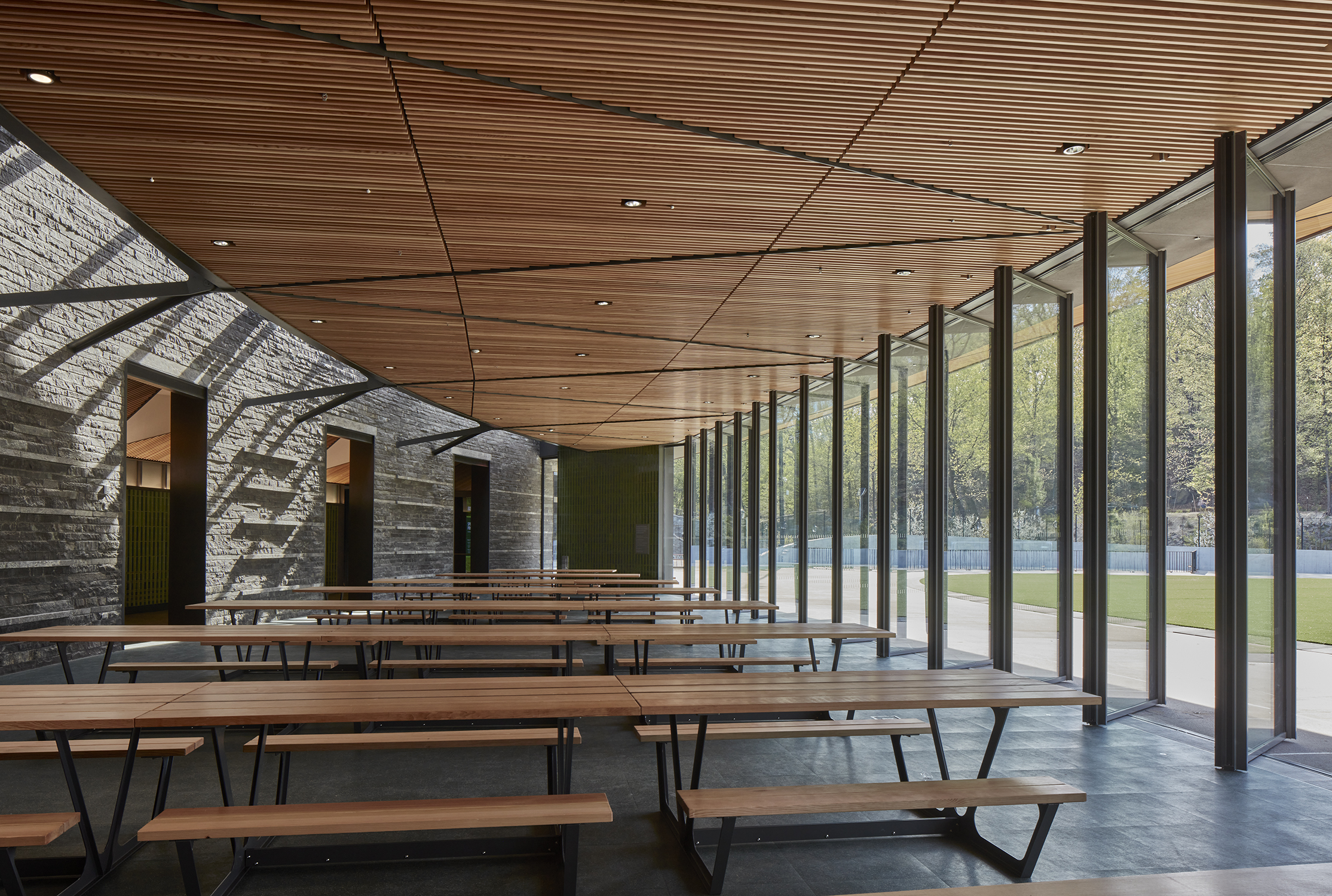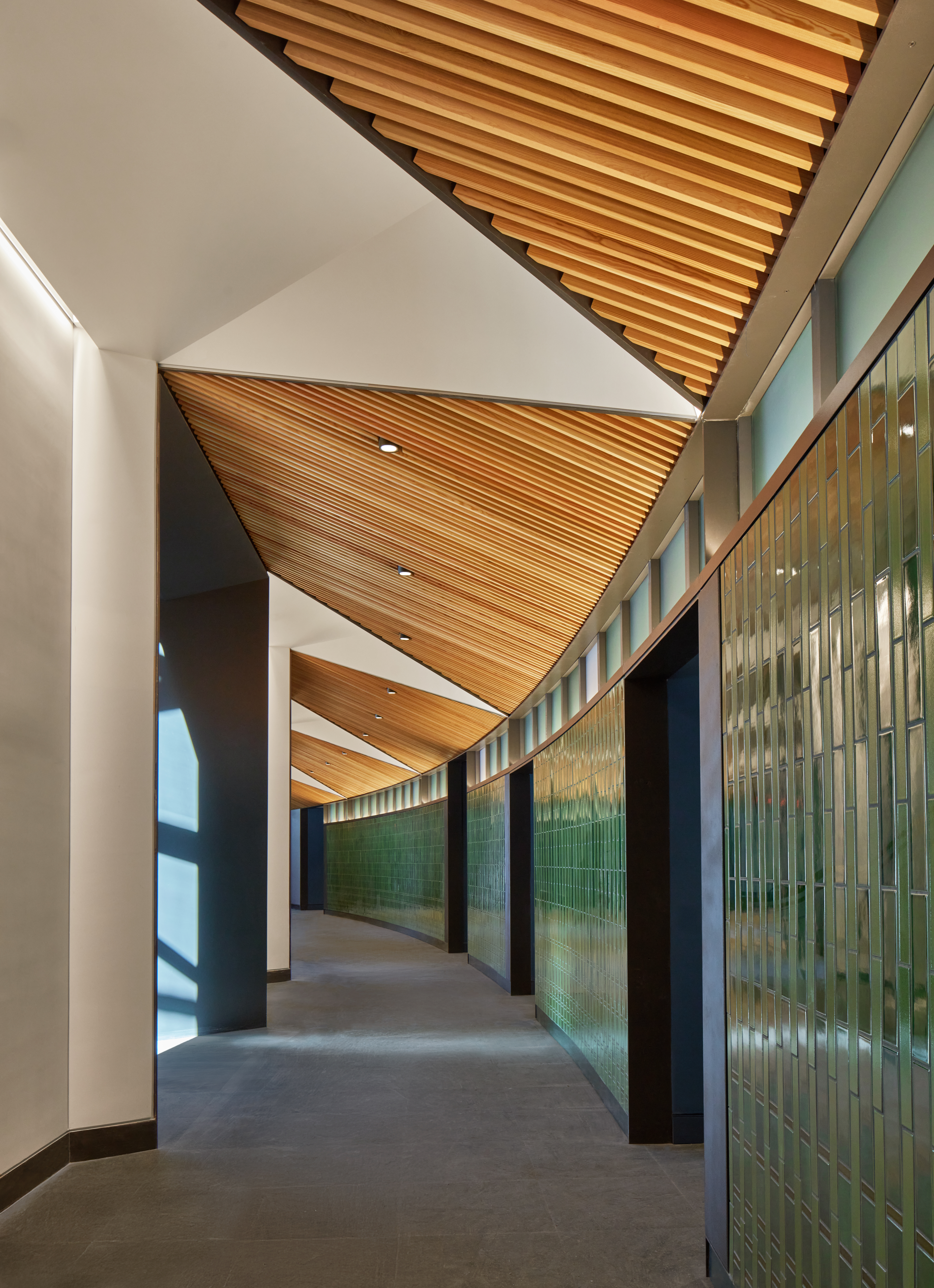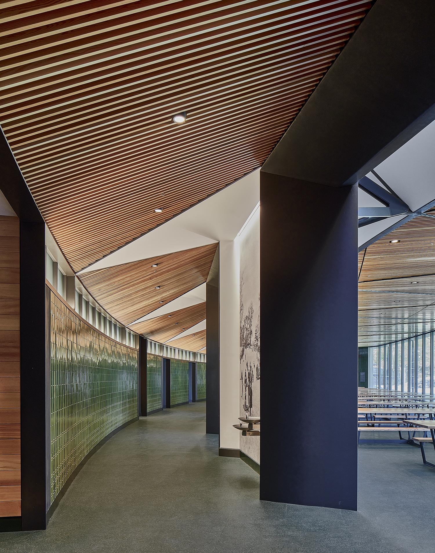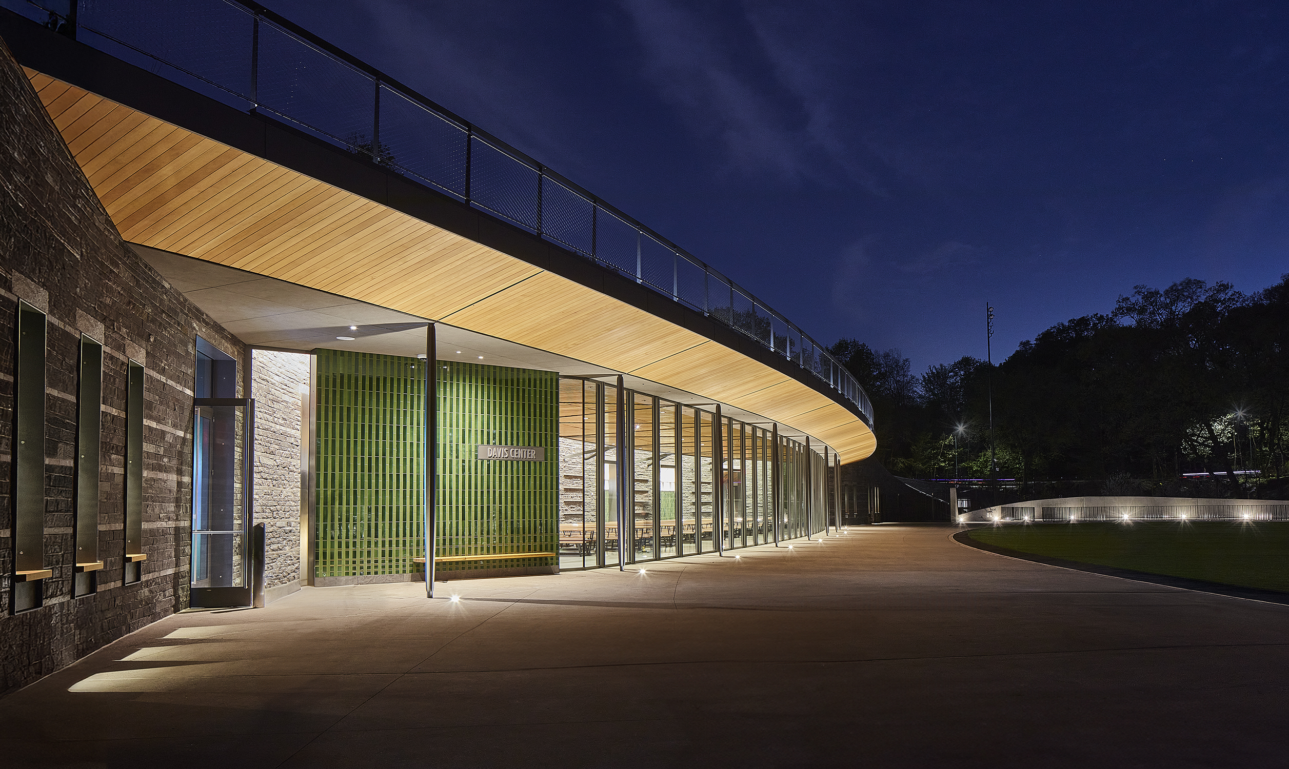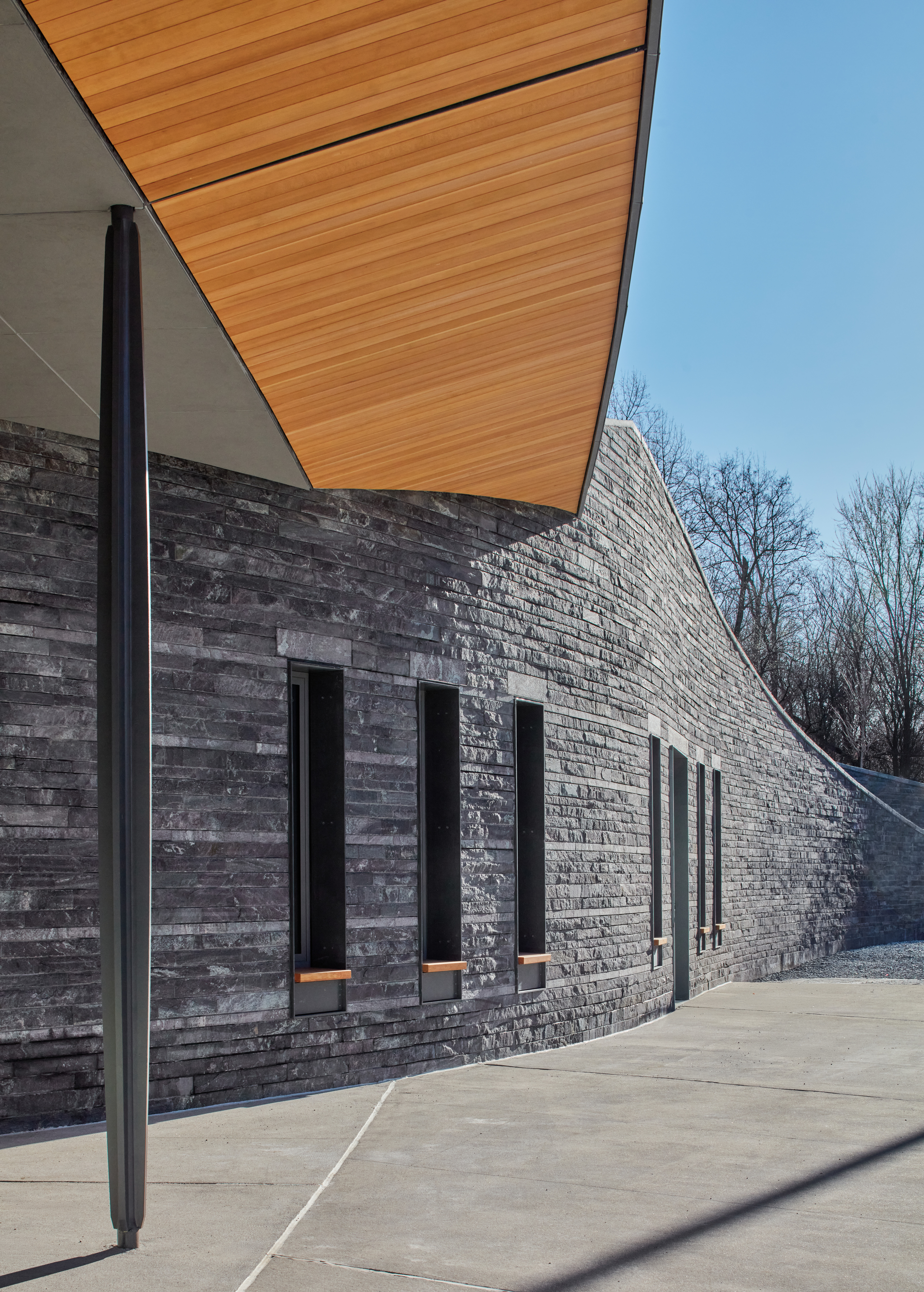 The new facility is built into the topography of the site, with landscape and park paths extending across the rooftop and creating a scenic overlook. Below, a light-filled gathering space with large floor-to-ceiling glass doors, punctuated by slender wood columns, opens onto the deck of the pool. Lockers, restrooms, and concessions are located behind a curved wall of locally quarried stone. The oval-shaped pool, which is transformed into a flexible public green in spring and fall and an ice-skating rink in winter, is framed by a low retaining wall enveloped by a landscape berm.
