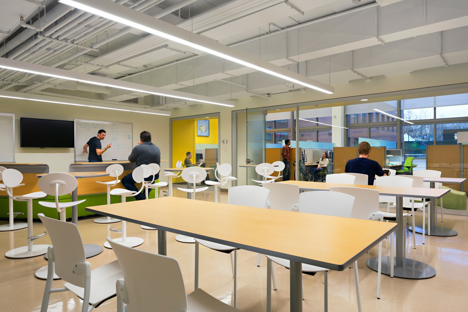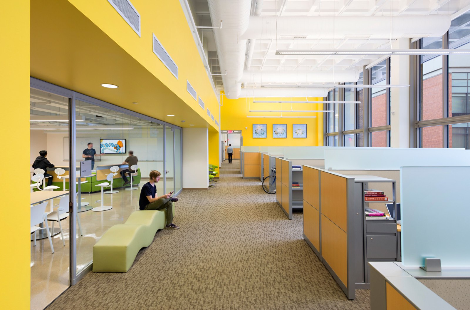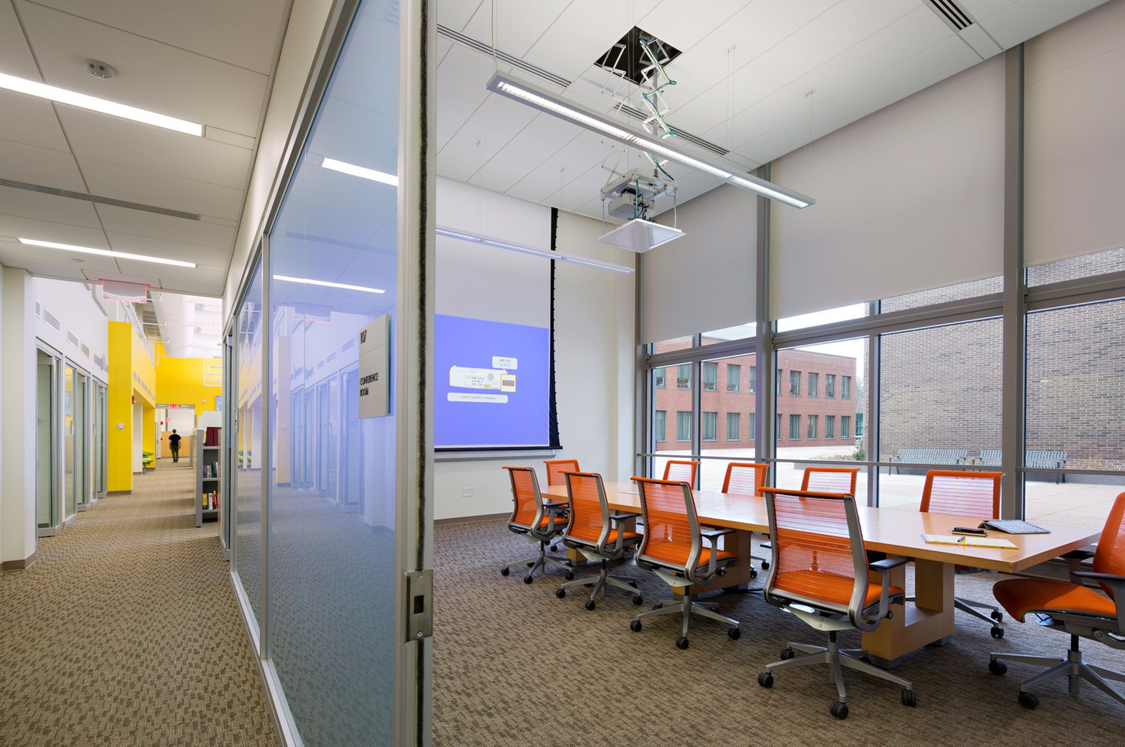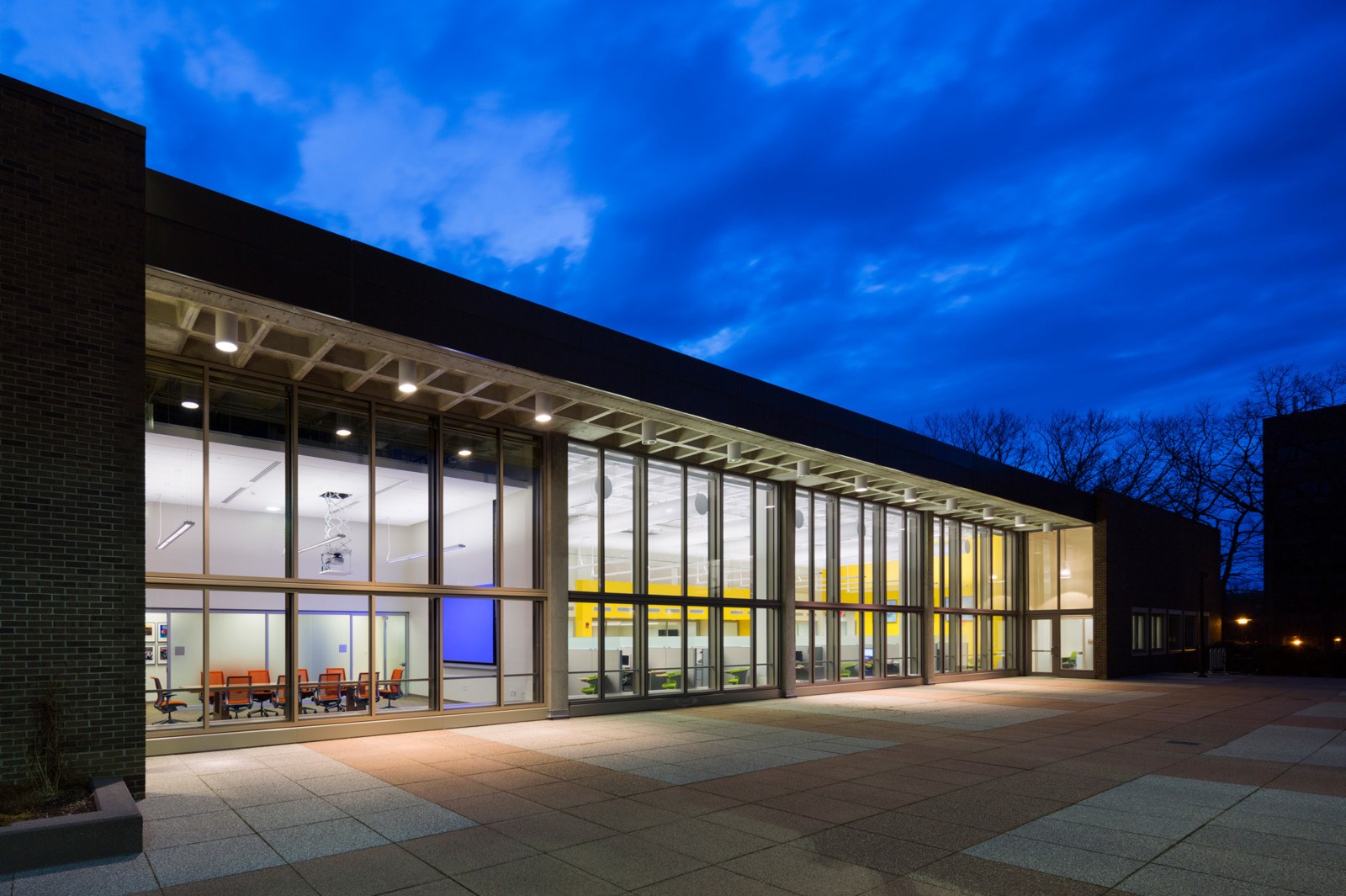 The building required extensive infrastructure upgrades including new air handlers, perimeter radiation, life safety provisions and curtainwall replacement. New window openings were created in existing masonry walls in faculty offices and meeting spaces, and a new server room was provided on the mezzanine level. The project also included an extensive arts program, including the installation of a commissioned sculpture by Bill Barrett entitled “Quest.”