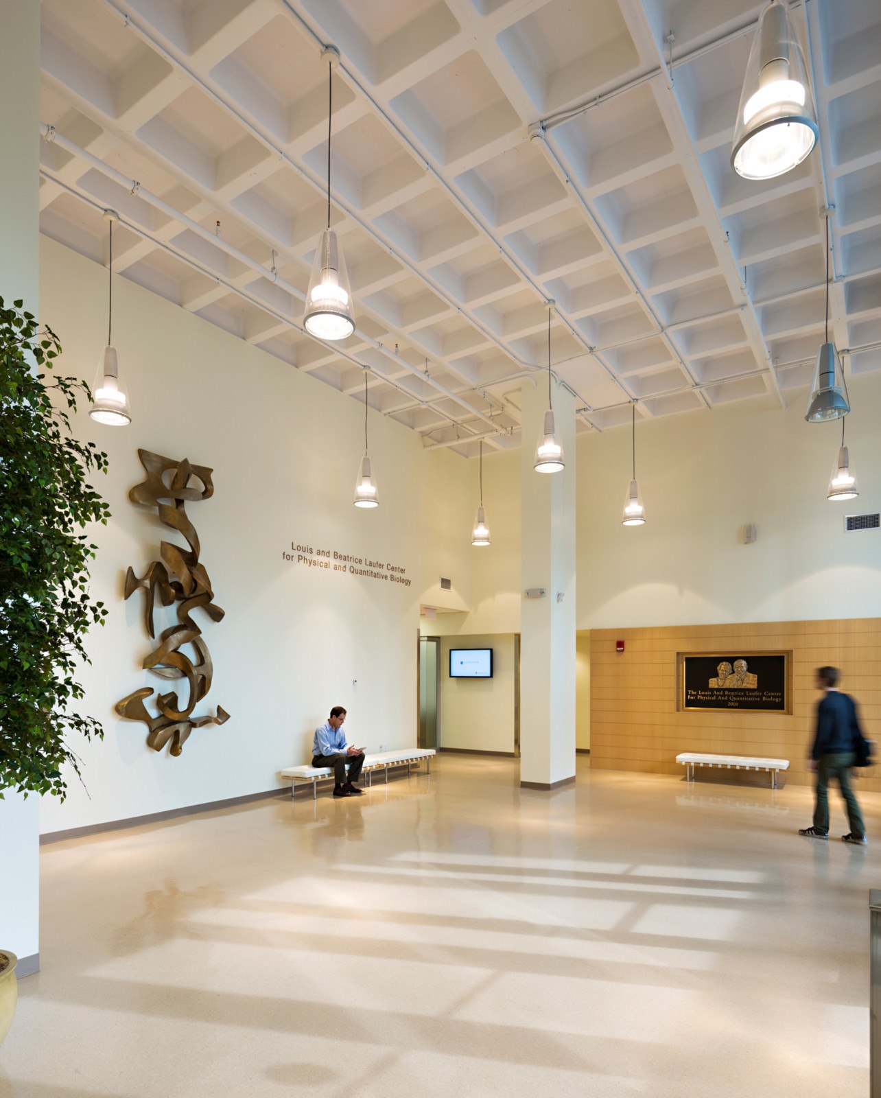 The Louis and Beatrice Laufer Center advances biology and medicine through discoveries in physics, mathematics, and computational science. Mitchell Giurgola proposed locating the facility in the vacant former Life Sciences Library, a site with abundant natural light and space for expansion that is prominently located near other related research facilities. The design consists of offices for eight faculty researchers and the Director, workstations for 40 graduate students and post-docs, administrative offices and workstations, and meeting spaces ranging in size from 4-6 person conference rooms up to a 75-seat Lecture Room. At the heart of the facility is the “Kitchen,” an informal meeting space equipped with teleconferencing facilities.