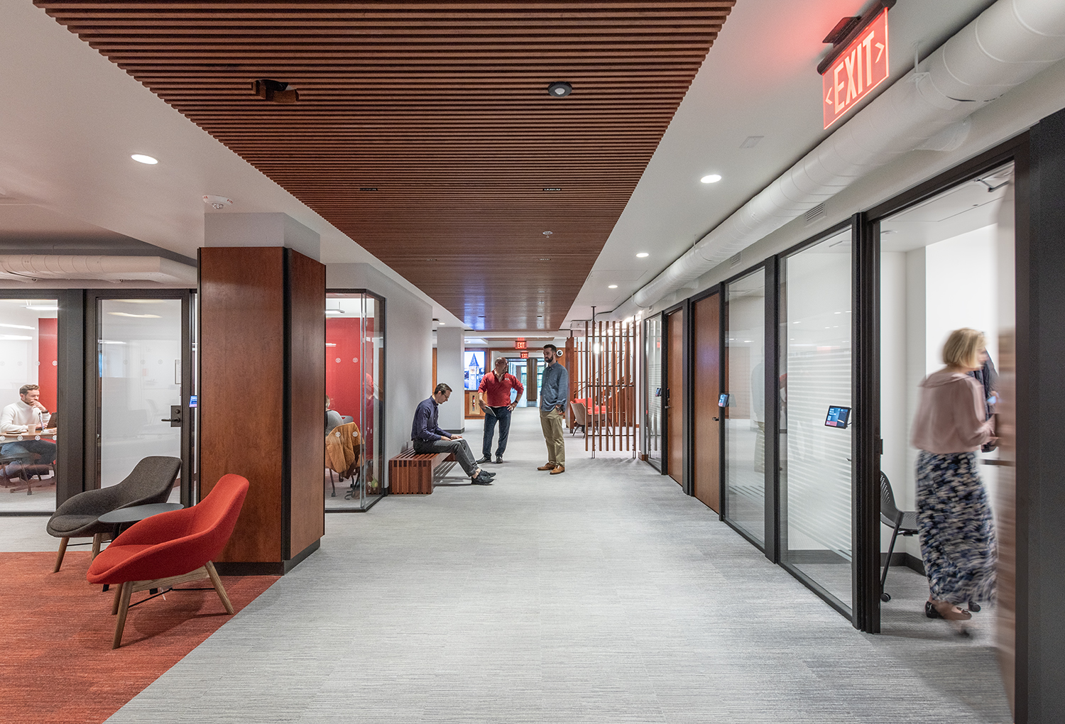 This project is a gut renovation and conversion of 8,000 sf of library stacks into student and adjunct spaces on the ground floor. The ground floor conversion created collaborative spaces for students and faculty at the juncture between the two major Law School buildings, Myron Taylor and Hughes. The ground floor stack space has not been renovated since the Jane Foster wing was added in 1988. The project also involved the renovation of the Jane Foster entrance on the first floor including updating the existing entry vestibule finishes and strengthening the connection into the daylit Jane Foster atrium space. A new glazed entrance door and transom provides a view into the vestibule, aligning with the recently renovated building entrance to the north. Both the ground floor and first floor work create more functional and integrated spaces for the school.