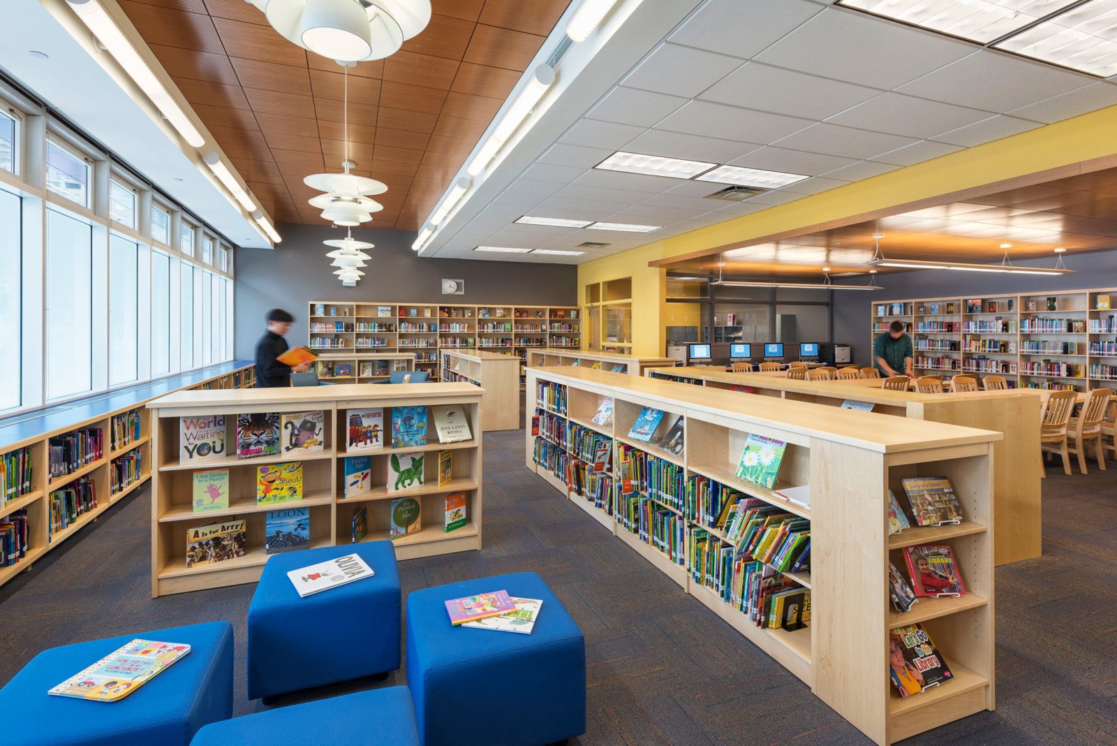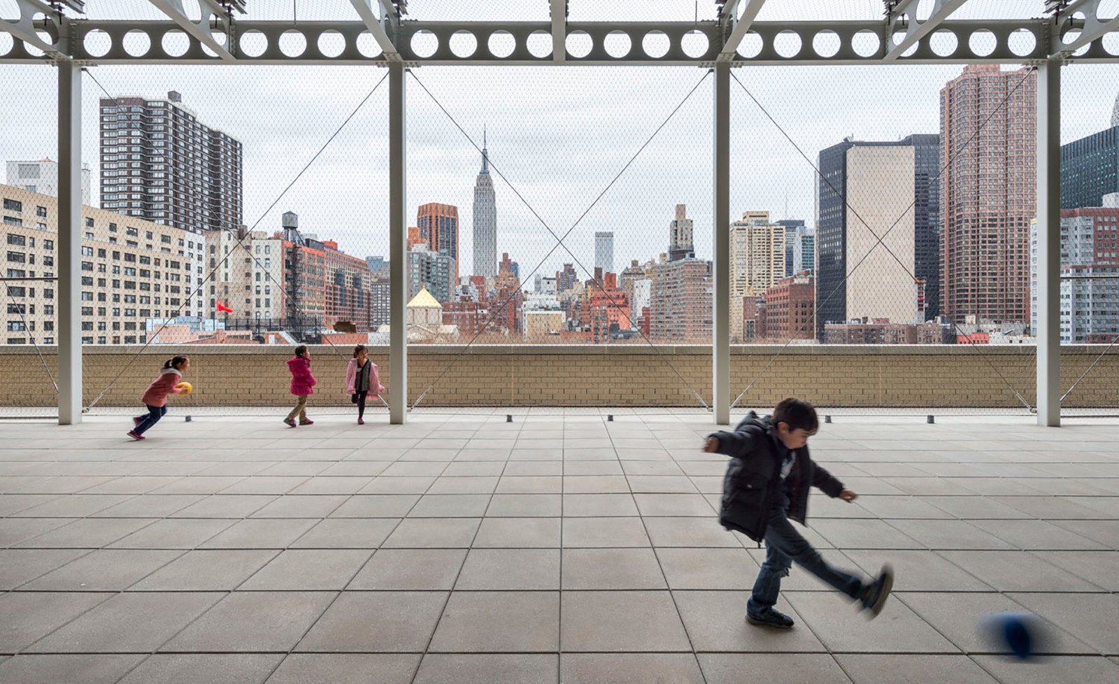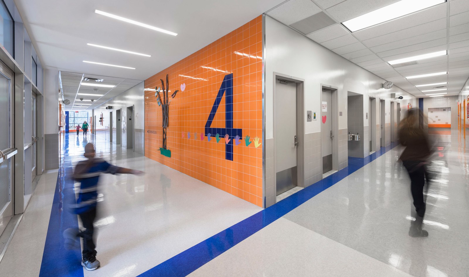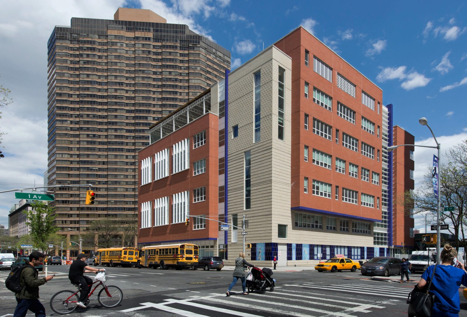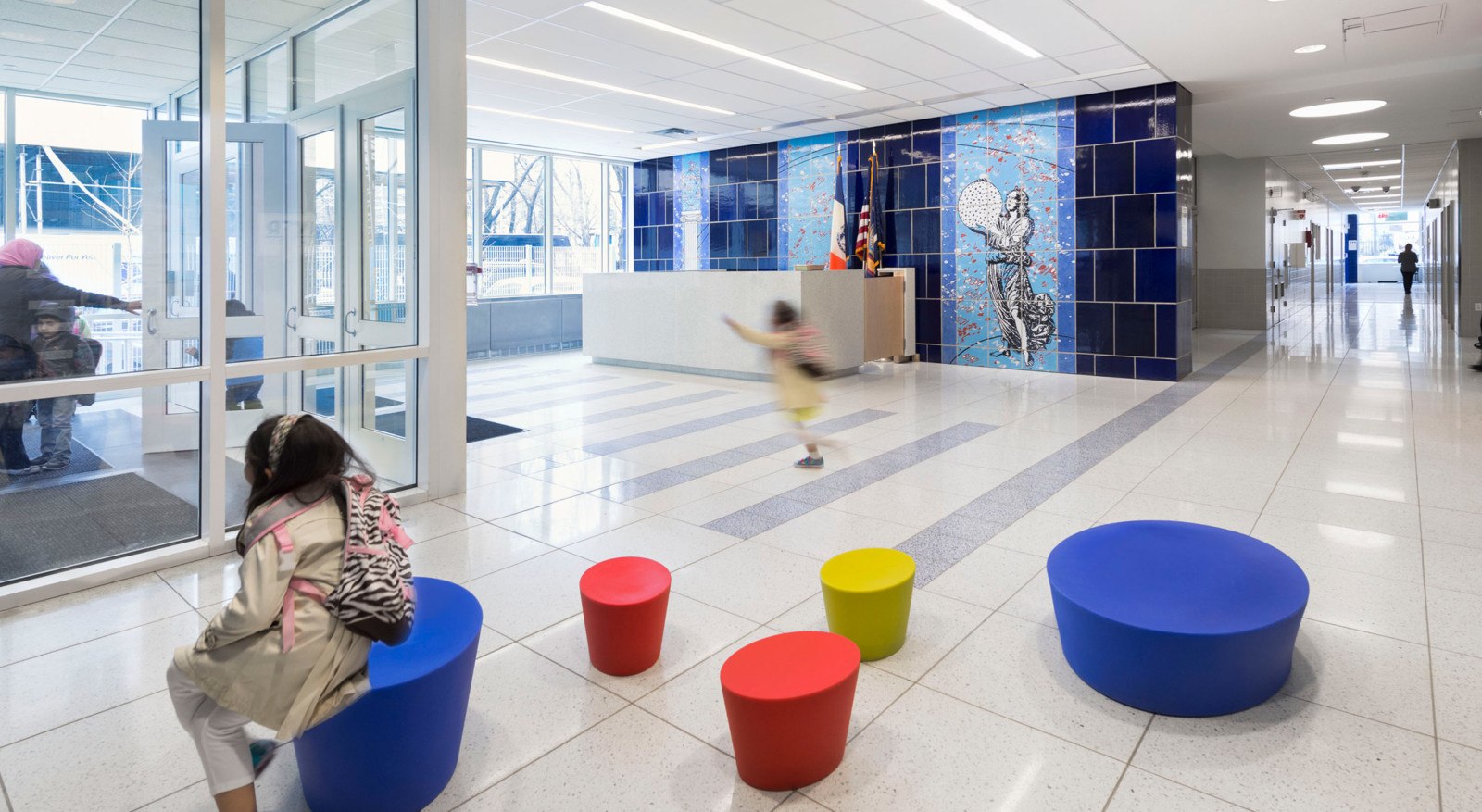 PS 281 is an urban school derived from a desire to create a singular, compact building that expresses the energy and spirit of its students while acting as a focal point and gathering place in its community. The school takes shape as a vertical building with an efficient six-story layout that accommodates 612 students in PreK – 8th grade, including students with special needs. Several large program areas were needed such as the library, gymnatorium, gymnasium and rooftop playground. Additional spaces include 17 classrooms, art and music rooms, science labs, and a cafeteria.