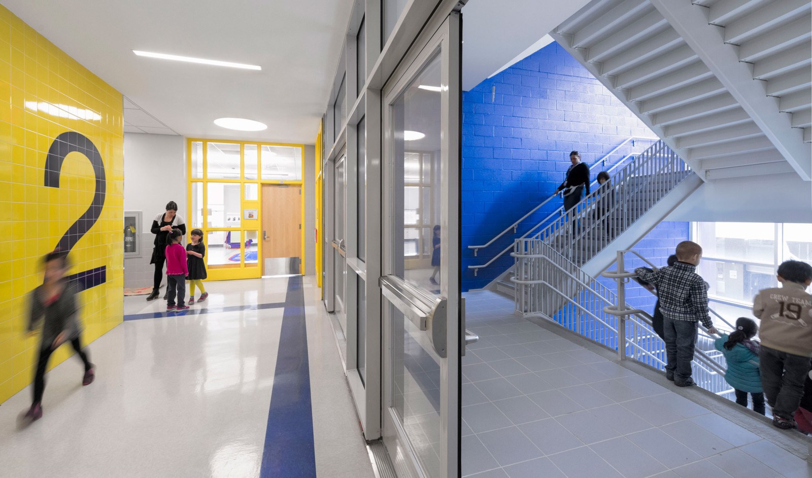 The primary challenge for this project was working within the constraints of a tight urban site. To address this, the design of the school focuses on using every opportunity to capture natural light and to use a bright primary color material palette along the exterior and interior to encourage an animated and playful school experience.