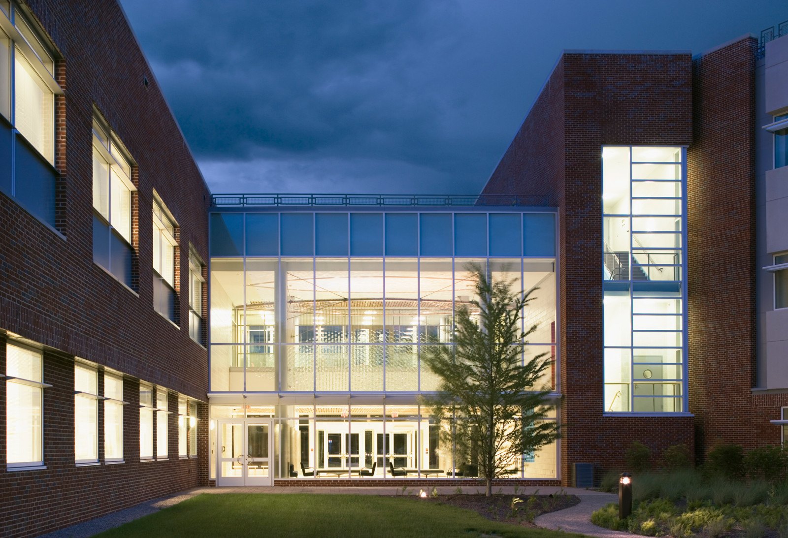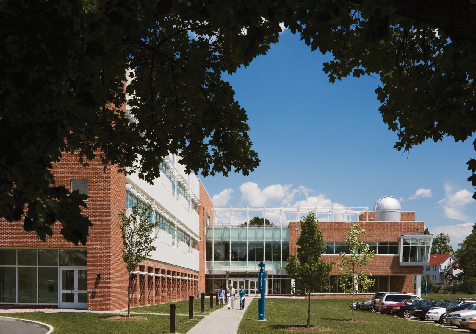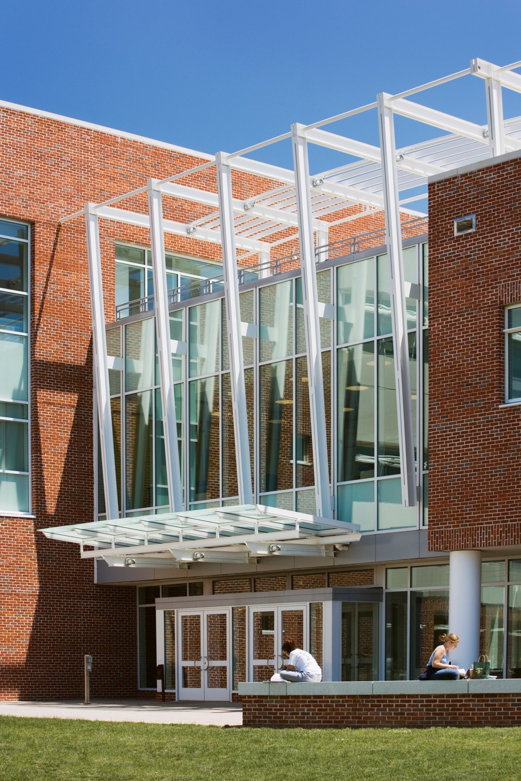 The project is the first academic building located outside the main quadrangle, however the expansion area remains anchored to the campus and the town. The materials used for the Silver LEED-Certified building firmly tie it to the fabric of the campus and create an image appropriate for modern science and technology. The two-story main entrance features a glass canopy and roof trellis, creating high visibility for the Science Building, and an outdoor gathering area ties directly to the lobby. The adjacent lounge, with its suspended glass sculpture, offers views through the quiet, contemplative garden landscape to the neighborhood and beyond.