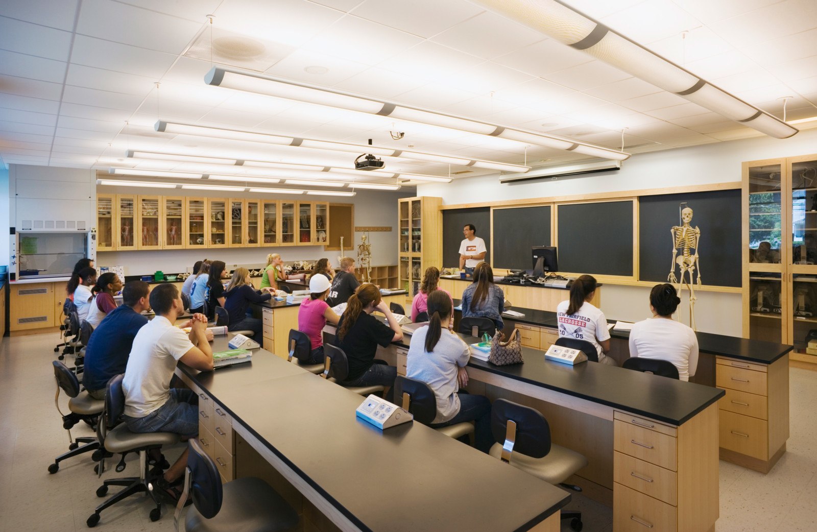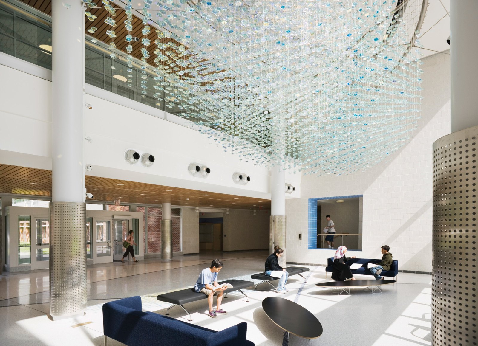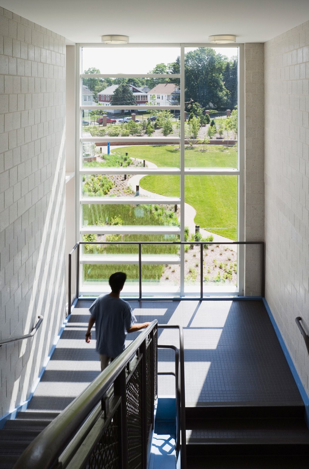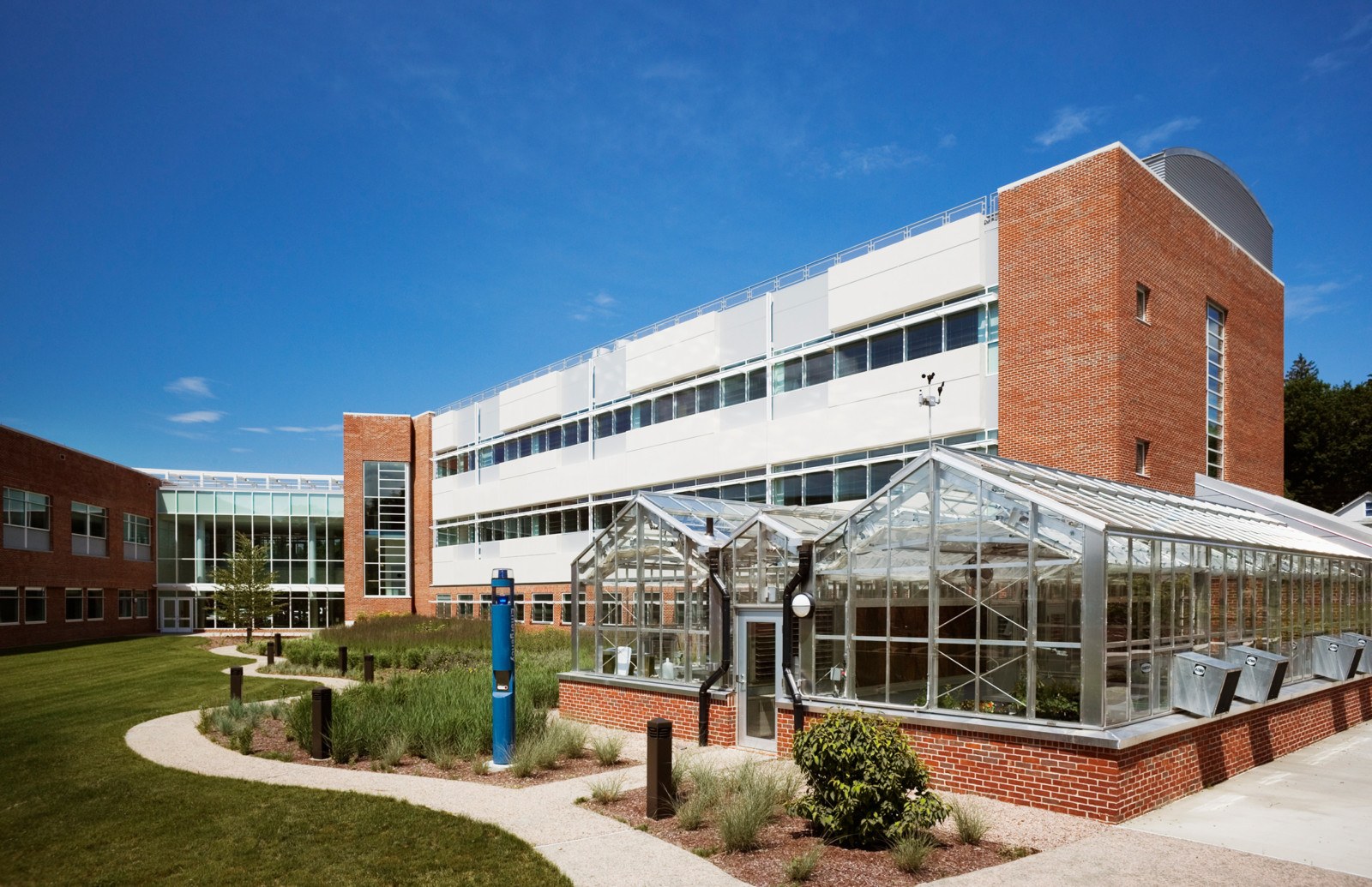 The project is the first academic building located outside the main quadrangle, however the expansion area remains anchored to the campus and the town. The materials used for the Silver LEED-Certified building firmly tie it to the fabric of the campus and create an image appropriate for modern science and technology. The two-story main entrance features a glass canopy and roof trellis, creating high visibility for the Science Building, and an outdoor gathering area ties directly to the lobby. The adjacent lounge, with its suspended glass sculpture, offers views through the quiet, contemplative garden landscape to the neighborhood and beyond.