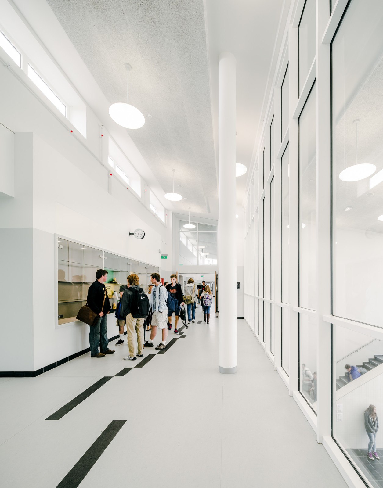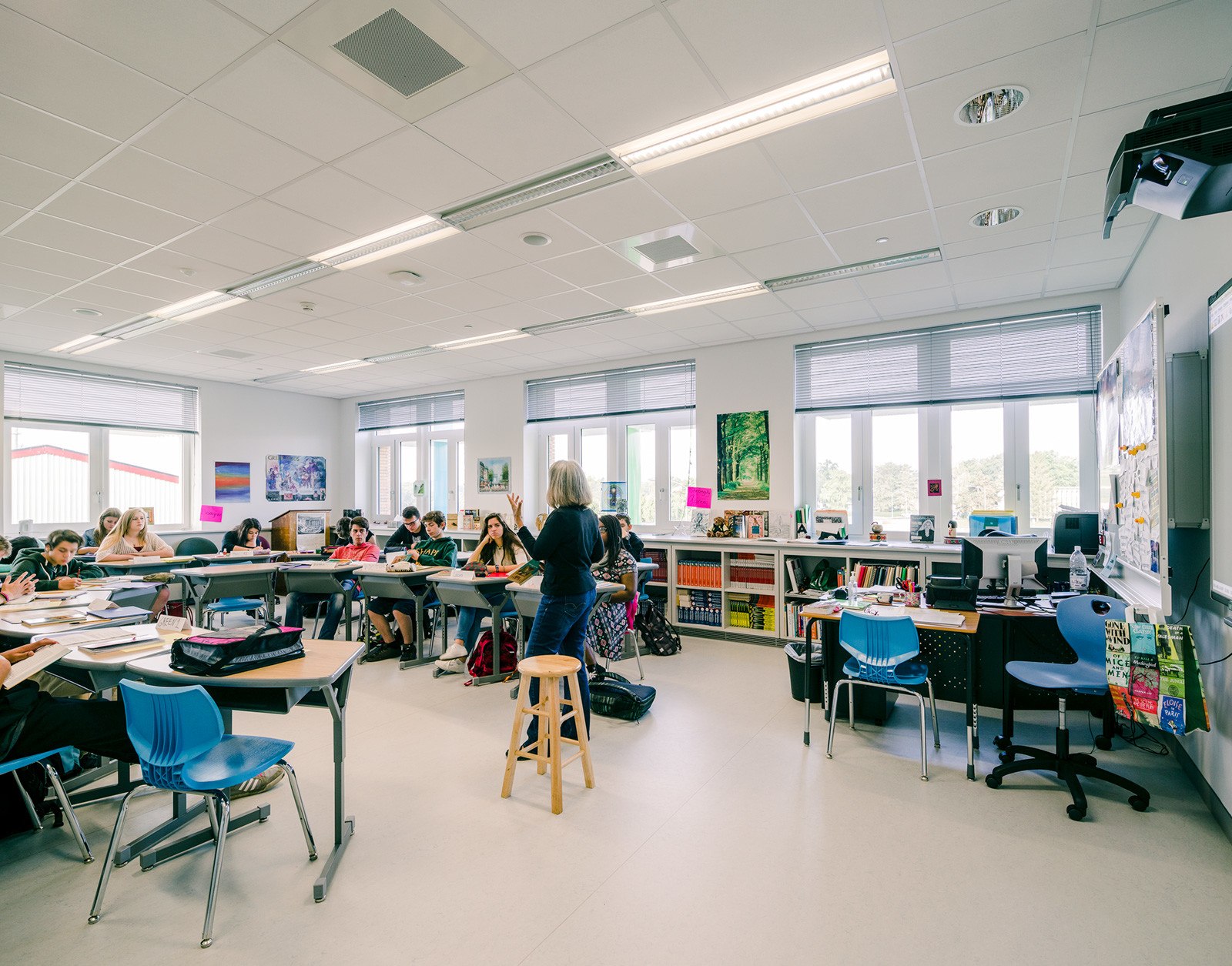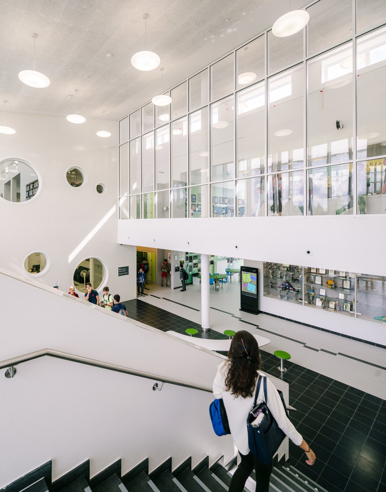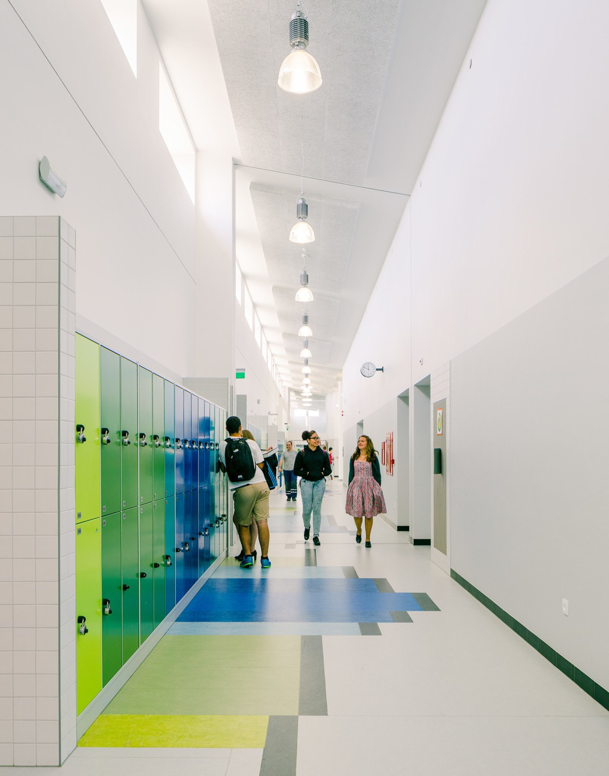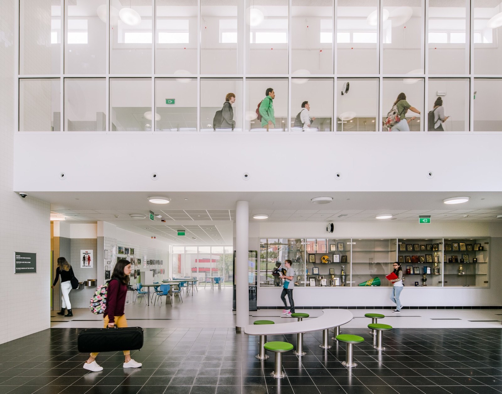 The two-story, 131,744 square-foot US High School encloses the lower end of the school Commons and houses general purpose classrooms, computer and science labs, and a culinary arts room and information center with views out towards the Commons. Designed for 21st century students, the schools are equipped with sophisticated information technology systems, including Smart Boards fully integrated into the school-wide data network, a video/broadcast studio, high-speed wireless internet, and voice-over-internet protocol supported digital services, which enhance and encourage communication capabilities for both staff and students.