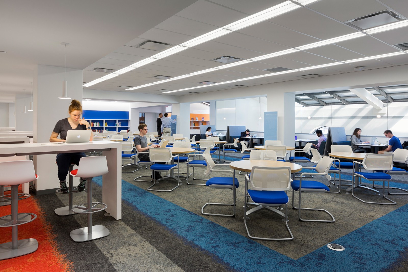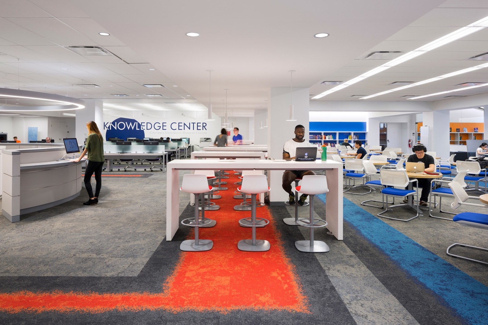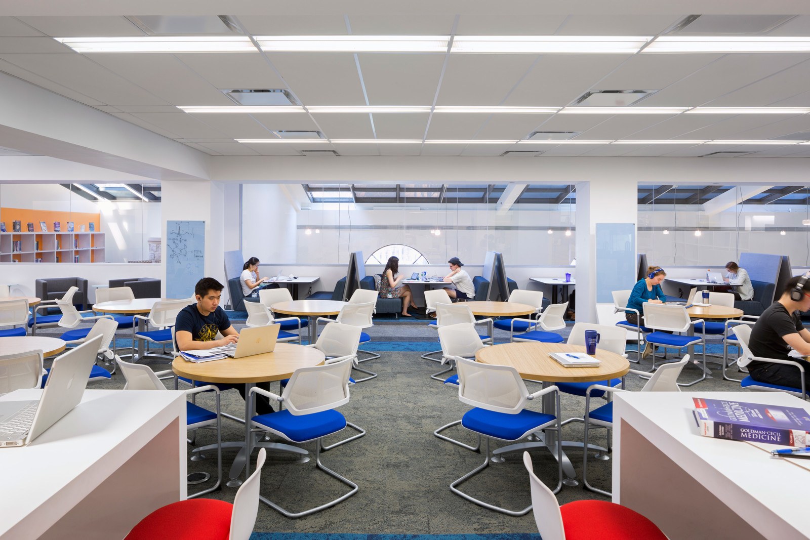 Following the completion of the Teaching and Learning Center, Mitchell Giurgola began working on upgrades to the school’s Health Sciences Library (HSL) to create the Knowledge Center. CUMC asked for a state-of-the-art space with 24-hour availability that would accommodate a variety of new space types including collaboration rooms, computer terminals, high counter seating, table seating, lounge space and training rooms. The renovation expanded library administrative space and allows for an increase in potential total occupants.