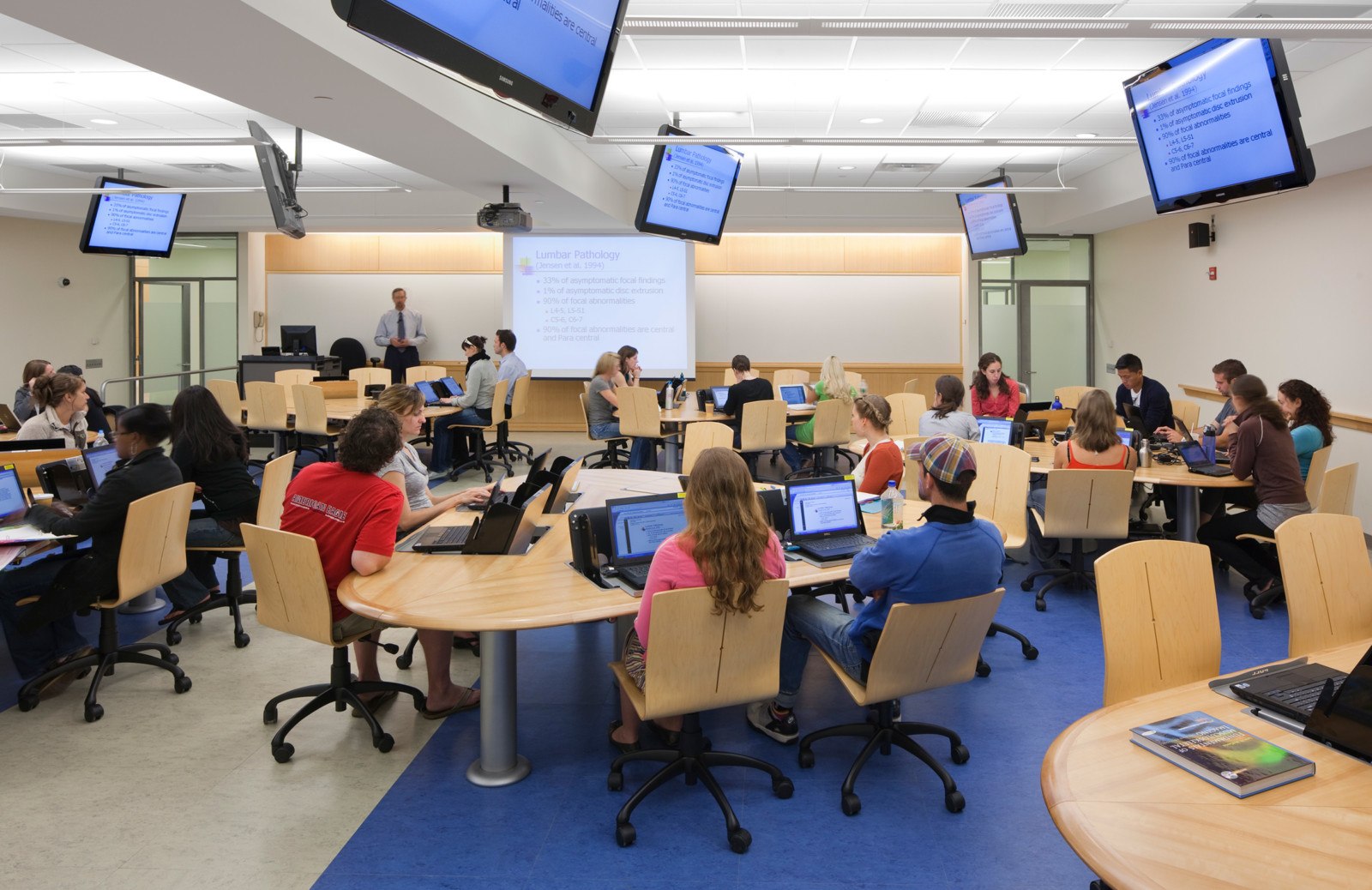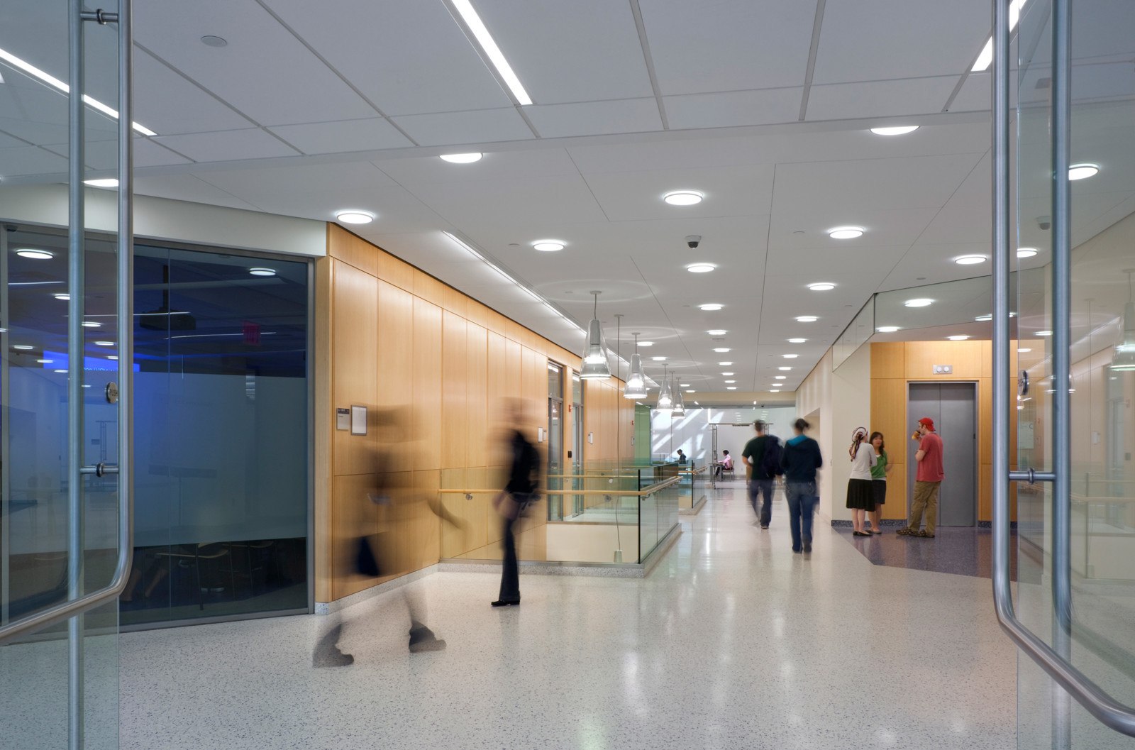 The Teaching and Learning Center is a classroom facility serving multiple schools within Columbia University Medical Center (CUMC). To create this much needed classroom and study space, Mitchell Giurgola designed the renovation of an area previously occupied by library stacks. The library collection was consolidated into high density mobile shelving located on the lowest level of the facility. These new stacks were then connected to the reading room and circulation desk on the floors above via a new triangular, glass-enclosed stainless-steel stairway. The project provides a total of 15 new classrooms that facilitate a highly interactive and collaborative computer-based curricular model, accommodating distance learning and computerized testing.